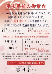 なお、年始1月1日(木)〜1月3日(土)は特別営業につき、昼の部・夜の部ともにサービス料10%、個室ご利用時はテーブルチャージを頂戴いたします。