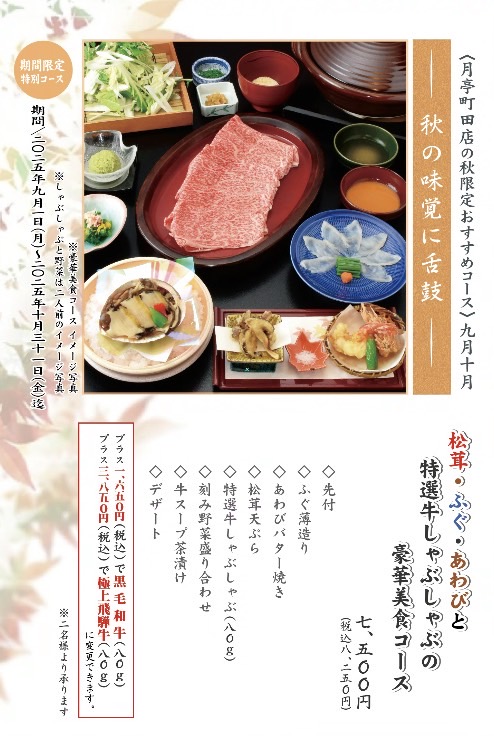 秋の味覚がたっぷりの「豪華美食しゃぶしゃぶコース」です。